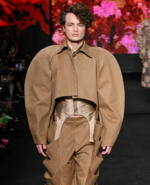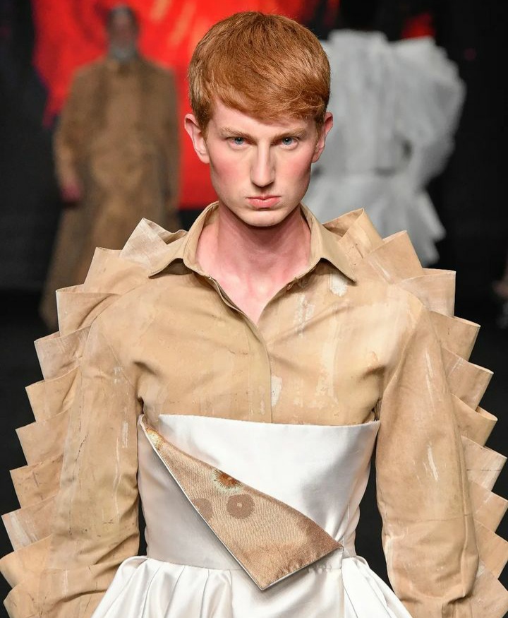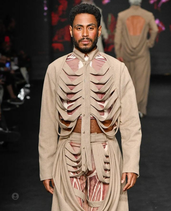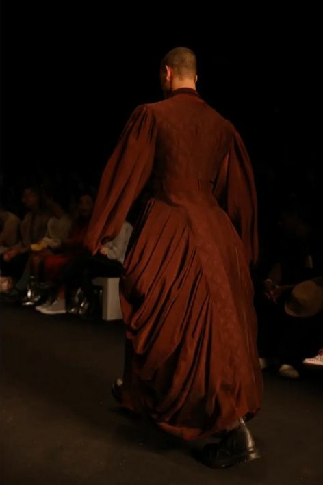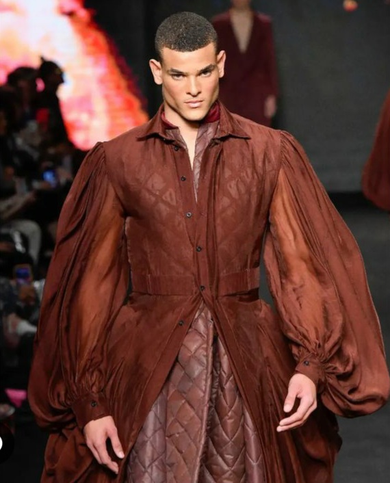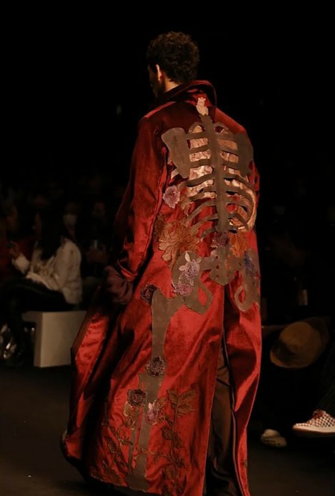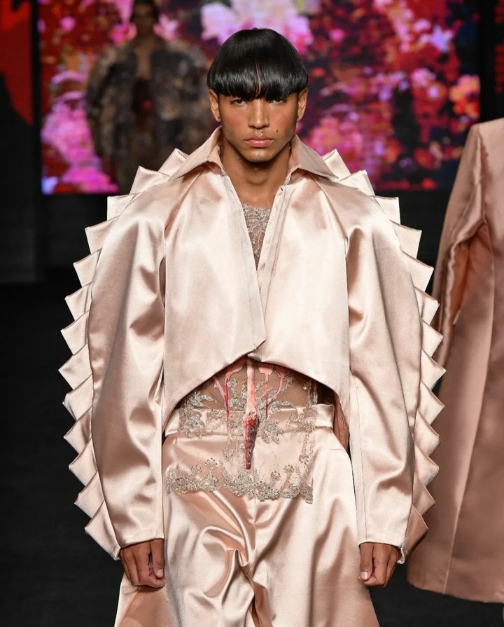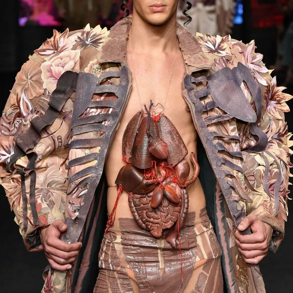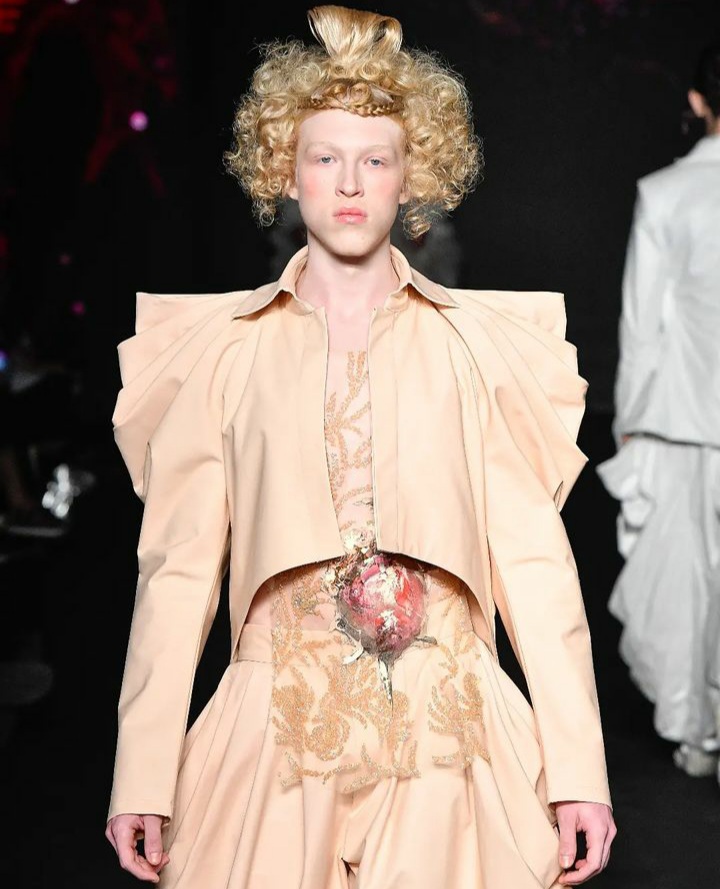 João Pimenta tem como princípio subverter tudo, esticar os parâmetros do que se considera moda masculina. No desfile “Das Tripas Coração”, mistura Renascimento com entranhas, esqueleto com drapeado, rito com sacrilégio. E nos vira do avesso, com majestade e beleza.
